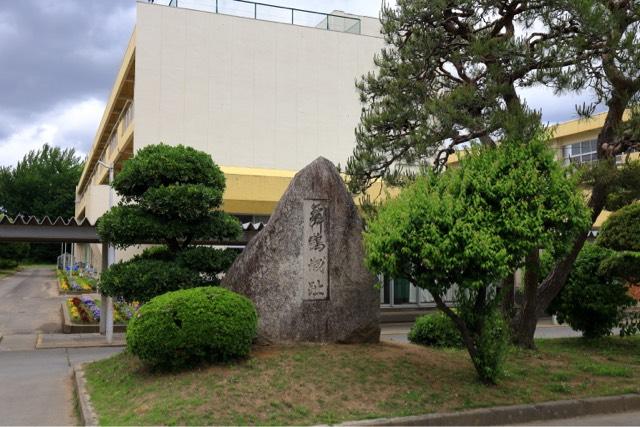 小学校の入り口の真ん中に石碑 町から見ると崖の上にある