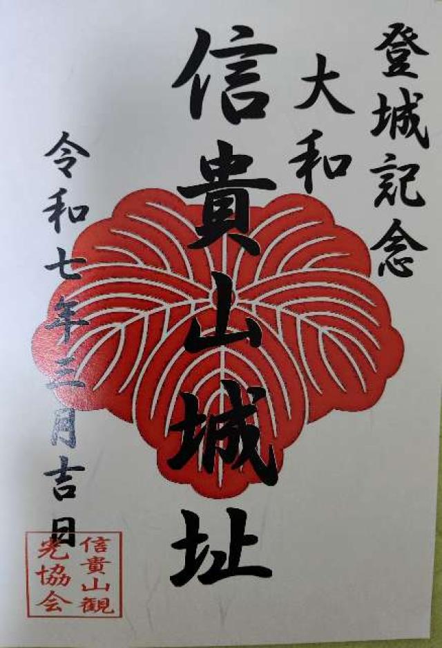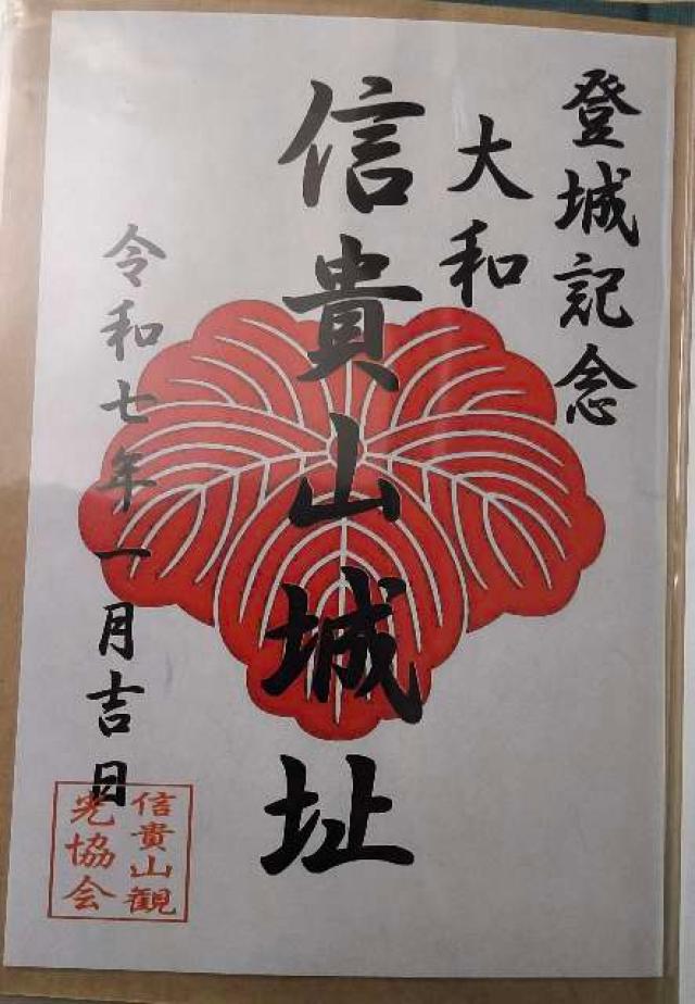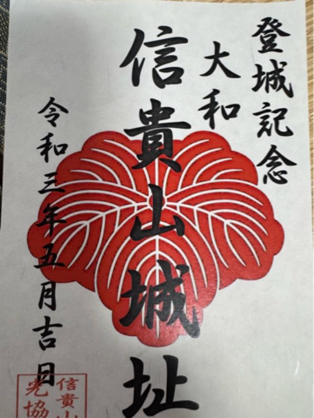 | お城情報 | 御城印は信貴山の麓の開運橋を渡った所にある信貴山観光センターにて販売しています。ここから朝護孫子寺に参拝して信貴山城跡までがおすすめです。 |