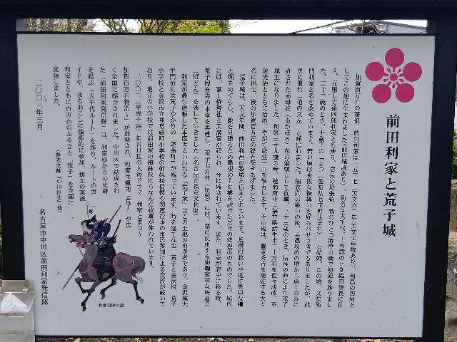 (くーさん) おすすめ度: ★★★ 前田利家パパ利昌築城。利家生誕地(前田城かも?)候補のひとつ。利家一家居城。ここから加賀百万石のお殿様になるなんて…、感慨深い〜。越前に移るとき廃城。 冨士大権現天満天神宮内に、説明版や碑がありますー。 | |||