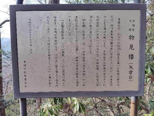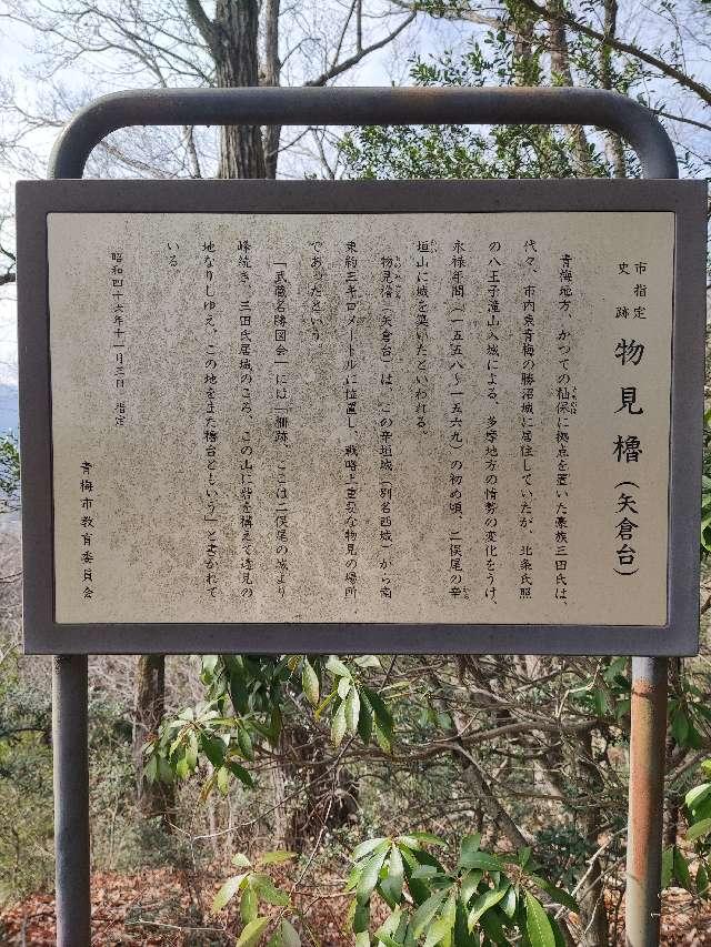(dougenさん) おすすめ度: ★ 宮ノ平駅の北側から青梅丘陵ハイキングコースの案内に従って登って行くとハイキングコースとの合流地点付近に矢倉台という休憩所があります。 三田氏の物見台があった場所で、青梅市の史跡にも指定され、解説板も設置されています。 遺構としては物見台跡ぐらいですが、眺めは良いです。 https://dougen2013.livedoor.blog/archives/23630605.html |