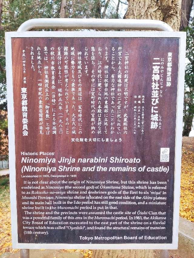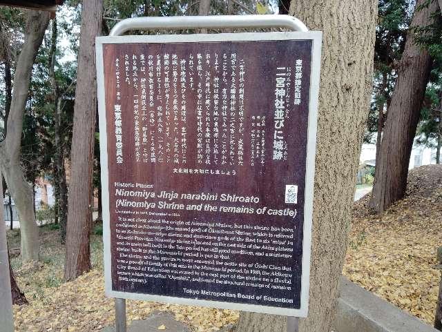 (dougenさん) おすすめ度: ★ JR五日市線東秋留駅から徒歩5分ぐらいのところにある二宮神社が二宮城の推定地となります。 二宮神社と城址として、都の旧跡に指定されていますが、推定地ということもあり、遺構が不明瞭ですが、城址っぽい地形は確認できます。 https://dougen2013.livedoor.blog/archives/23660199.html |